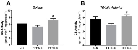 Citrate synthase activity normalized to muscle protein content in the soleus (A) and the tibialis anterior (B). Offspring from the control diet sedentary group (C–S); offspring from the high-fat, high-sucrose diet sedentary group (HFHS–S); offspring from the high-fat, high-sucrose diet exercised group (HFHS–E), n = 6. Data are expressed as the mean ± SEM. Statistically significant differences (p ≤ 0.05) are indicated as follows: # vs. HFHS–S. The coefficient of variation in the soleus was: 6.8% for the C–S group; 4.5% for the HFHS–S group; and 4.3% in the HFHS–E group. In the tibialis anterior the coefficient of variation was: 5.7% for the C–S group; 7.1% for the HFHS–S group; and 2.7% in the HFHS–E group.