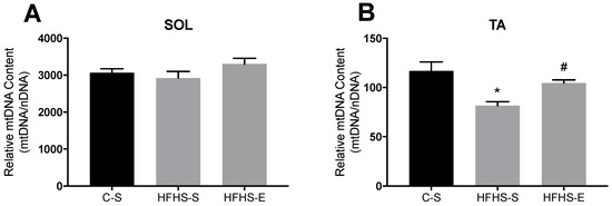 Effects of diet and exercise in mitochondrial DNA content of (A) the soleus (SOL) and (B) the tibialis anterior (TA) muscles. Offspring from the control diet sedentary group (C–S); offspring from the high-fat, high-sucrose diet sedentary group (HFHS–S); offspring from the high-fat, high-sucrose diet exercised group (HFHS–E), n = 6. Data are expressed as the mean ± SEM. Statistically significant differences (p ≤ 0.05) are indicated as follows: * vs. C–S, # vs. HFHS–S. The coefficient of variation in the soleus was: 1.9% for the C–S group; 2.4% for the HFHS–S group; and2.4% in the HFHS–E group. In the tibialis anterior the coefficient of variation was: 2.6% for the C–S group; 2.1% for the HFHS–S group; and 1.8% in the HFHS–E group.