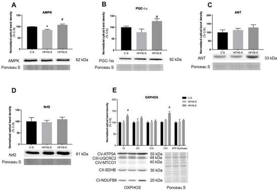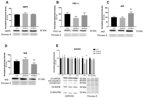 Relative protein content of 5′ adenosine monophosphate-activated protein kinase (AMPk) (A); peroxisome proliferator-activated receptor-γ coactivator-1α (PGC-1α) (B); and adenine nucleotide translocator (ANT) (C). Nuclear factor-erythroid factor 2-related factor 2 (Nrf2) (D) and oxidative phosphorylation subunits (OXPHOS) (E) in the tibialis anterior muscle. Offspring from the control diet sedentary group (C–S); offspring from the high-fat, high-sucrose diet sedentary group (HFHS–S); offspring from the high-fat, high-sucrose diet exercised group (HFHS–E), n = 6. Data are expressed as the mean ± SEM. Statistically significant differences (p ≤ 0.05) are indicated as follows: * vs. C–S, # vs. HFHS–S.