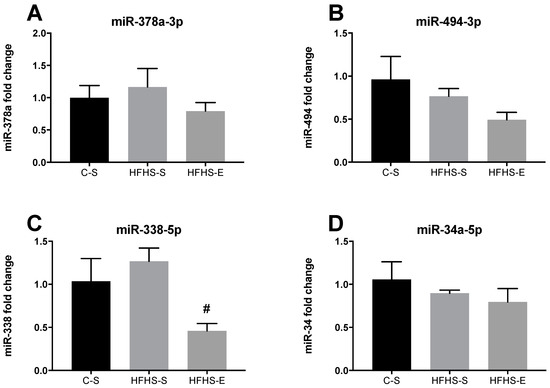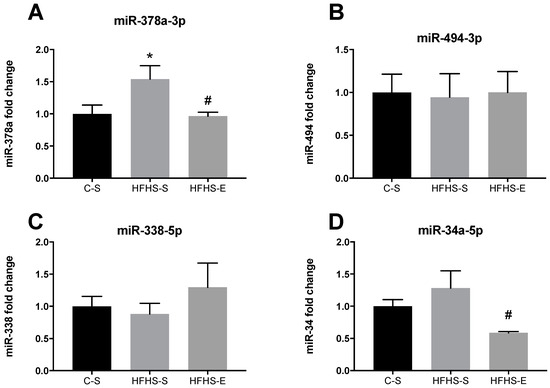 Expression levels of miR-378a-3p (A), miR-494-3p (B), miR-338-5p (C), and miR24a-5P (D) in the tibialis anterior. Offspring from the control diet sedentary group (C–S); offspring from the high-fat, high-sucrose diet sedentary group (HFHS–S); offspring from the high-fat, high-sucrose diet exercised group (HFHS–E), n = 6. Data are expressed as the mean ± SEM. Statistically significant differences (p ≤ 0.05) are indicated as follows: # vs. HFHS–S.