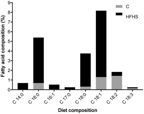 Seven-week-old female Sprague-Dawley rats (150–200 g) were obtained from Charles River Laboratories (L’Arbresle, France) and were randomly divided into two diet groups: control (C) and high-fat, high-sucrose (HFHS) diets. HFHS contained 42% metaolizable energy from fat (vs. 10% in C), 27% from proteins (vs. 20% in C), and 31% from carbohydrates (mainly sucrose, vs. 70% in C with 1% sucrose), with crude fat of 23.1% (vs. 4.1% in C), high cholesterol content, and an increased proportion of long-chain fatty acids (FA) (Figure 8).