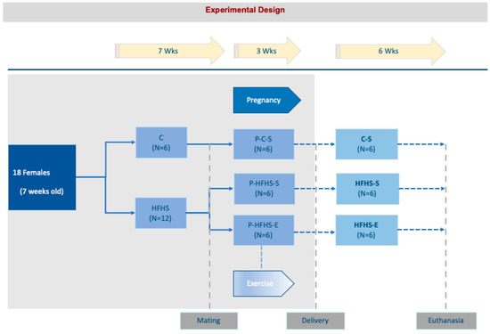 After 7 weeks on the respective diets (C: E157452–047 or HFHS: D12451(II)mod., Ssniff, Soest, Germany), HFHS dams were divided into two subgroups: HFHS–sedentary dams (P–HFHS–S); and HFHS–exercised dams (P–HFHS–E). The C-diet group remained sedentary throughout the protocol (P–C–S). After the establishment of the three experimental groups (n = 6 per group), dams were mated with sedentary C-fed male rats (Charles River, L’Arbresele, France). The morning the vaginal plug was present was considered day 0.5 of pregnancy. After delivery, litter size was reduced to 3 male and 3 female pups to avoid food competition and negative effects on pups’ body mass and development. After 3 weeks of nursing, corresponding male offspring were weaned and identified as (n = 6 per group): C–S offspring from P–C–S, HFHS–S offspring from P–HFHS–S, and HFHS–E offspring from P–HFHS–E (Figure 9). Thereafter, offspring were fed with a standard diet and remained sedentary until euthanasia at 6 weeks of age.
