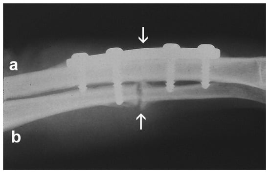 Fracture healing in two different mechanical strain environments. Fracture sites are indicated by arrows. The radius (a) fixed with a rigid plate, and experiencing minimal mechanical strain, is healing by direct osteonal repair. The ulna (b), which is in a more flexible mechanical environment, and is experiencing motion and strain, is healing by endochondral bone formation. For both the radius and the ulna, the ECM and gene expression of the repair are being regulated by the biophysical environments. Reproduced with permission from Aaron RK, Bolander ME (eds). Physical Regulation of Skeletal Repair. Rosemont, IL: American Academy of Orthopaedic Surgeons; 2005.