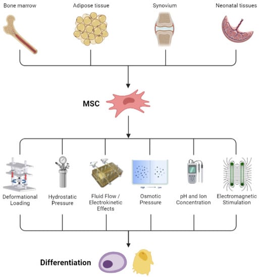 Representation of the harvest of MSCs from multiple tissue sources and biophysical stimulation of the cells to induce differentiation.