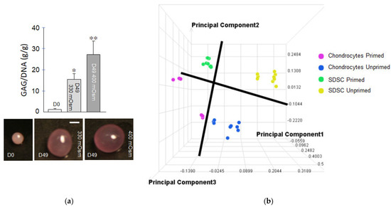 (a) Glycosaminoglycan (GAG) content of SDSC micropellet cultures was promoted by physiologic hypertonic media (400 mOsm) relative to isotonic media (330 mOsm), similar to that reported for SDSCs in 3D hydrogel culture [28]. * p < 0.05 vs D0; ** p < 0.05 vs other groups (n = 3–4/group). Scale bar: 1mm. (b) Principal component analysis of Z-score transformed intensity data processed by the Elucidator program for the 33 LC/MS chromatograms performed in a study [25] where canine SDSCs were primed in culture media containing (1 ng/mL TGF-β1, 5 ng/mL bFGF, and 10 ng/mL PDGF-BB). Each data point represents a chromatogram. Data from unprimed cells are found on the right side of the first principal component axis. Data from primed cells are grouped on the left side of that axis, suggesting an overall global effect of the growth factor priming. The distance between unprimed and primed chromatograms was greater for SDSCs than for chondrocytes, suggesting that priming yielded a more pronounced effect for SDSCs. Unpublished data from Dr. Hung’s laboratory.
