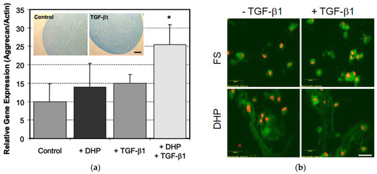 (a) Human BMSCs encapsulated in alginate were cultured in chondrogenic media +/− applied dynamic hydrostatic pressure (DHP, 3 MPa, 0.33 Hz, one hour per day) or free-swelling (FS) +/−10 ng/ mL TGF-β1. Inset: Alcian blue staining for glycosaminoglycans, scale bar = 250 µm. Aggrecan mRNA levels normalized to β-actin on day 14 (* p < 0.025, n = 3). (b) Type II collagen staining (green) with ethidium homodimer stained nuclei (red) on day 14. Scale bar = 50 µm.