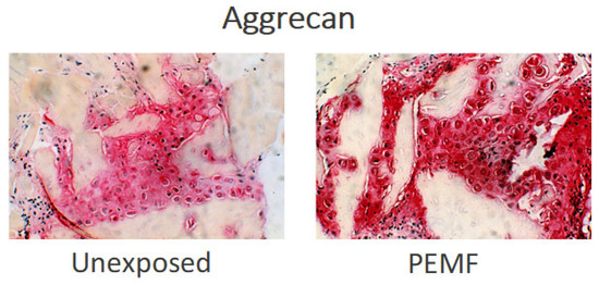 Immunohistochemistry of aggrecan during chondrogenesis (day 8 of ossicle development). Gray areas are DBM particles; red areas represent aggrecan. Ossicles exposed to PEMF stimulation during development form a greater amount of aggrecan than the unexposed controls, as demonstrated by increased areas and intensity of aggrecan staining [65].