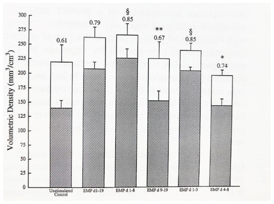 Ossicles exposed during the mesenchymal and chondrogenic phases (days 1–8) or the mesenchymal phase (days 1–3) exhibit trabecular volume and maturation equivalent to that seen in ossicles stimulated throughout their developmental sequence (Figure 8) [66]. Ossicles stimulated during chondrogenesis or bone formation only did not exhibit more bone formation or maturation. These observations indicate that exposure to PEMF during the mesenchymal phase of endochondral bone formation increases the downstream maturation of trabecular bone.