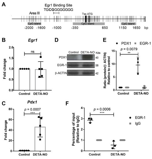 It has recently been reported that EGR-1 plays a crucial role in promoting β cell identity, maintaining β cell characteristics, and repressing non-β cell programs [19]. Moreover, EGR-1 is known to contribute to the glucose responsiveness and function of pancreatic β cells through the regulation of insulin and Pdx1 expression [20,21]. Pdx1 is a transcription factor essential for pancreatic development and β cell maturation, and appropriate regulation of its expression is instrumental to the generation of insulin-producing cells from PSCs. We previously defined that exposure to high concentrations of DETA-NO causes mESCs’ differentiation by downregulating pluripotency genes such as Nanog and Oct4, and upregulating differentiation genes including Pdx1 [25]. We also described some of the mechanisms involved in Pdx1 upregulation after DETA-NO treatment. Specifically, we revealed that PRC2 and P300 negatively regulate Pdx1 gene expression in mESCs cultured under pluripotent conditions, and we observed that NO induces changes in the methylation pattern of the Pdx1 promoter and leads to a shift in the balance of H3K27me3 and H3K4me3 occupancy at the proximal CpG island [26]. Thereafter, the present study was focused on elucidating the mechanisms by which EGR-1 regulates the expression of Pdx1 during endoderm differentiation triggered by exposure to DETA-NO in mESCs.