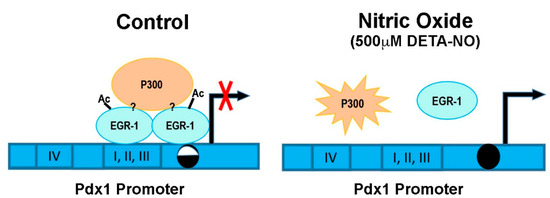 We previously reported that exposure to high concentrations of the chemical nitric oxide (NO) donor diethylenetriamine nitric oxide adduct (DETA-NO) causes ESC differentiation by downregulating pluripotency genes Nanog and Oct4, and upregulating differentiation genes such as Pdx1 [25]. We later elucidated the repressor role of polycomb repressor complex 2 (PRC2) and histone acetyltransferase P300 (P300) on Pdx1 gene expression. Additionally, epigenetic study of the Pdx1 promoter reveals that NO induces changes in the methylation pattern and leads to a shift in the balance of H3K27me3 and H3K4me3 occupancy [26]. In the present study, we investigate the involvement of EGR-1 in the regulation of Pdx1 expression in mouse ESCs (mESCs) after exposure to DETA-NO. The results show that EGR-1 represses Pdx1 gene expression in mESCs. Mechanistically, we propose that DETA-NO modifies the methylation degree of the EGR-1 binding site to the Pdx1 promoter and EGR-1 acetylation state, and consequently, reduces the EGR-1 binding capacity to the Pdx1 promoter, thus allowing Pdx1 expression.
