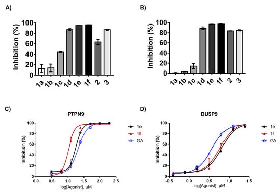 Inhibitory activities of GA analogs against PTPN9 (A) and DUSP9 (B). For each compound, the final enzyme concentration was 50 µM and 20 µM for PTPN9 and DUSP9, respectively. PTPN9 (0.15 nM) and DUSP9 (200 nM) were added to the mixture consisting of DiFMUP (220 µM for PTPN9 and 90 µM for DUSP9) and each compound (50 µM for PTPN9 and 20 µM for DUSP9). Enzyme activity was measured by monitoring the change in fluorescence intensity at Ex/Em = 365/450 nm. Enzyme inhibitory effects were evaluated by comparing enzyme activity in the presence of DMSO as a control, as well as each compound dissolved in DMSO. Determination of IC50 values for 1e, 1f, and GA against PTPN9 (C) and DUSP9 (D). The inhibitor concentrations used to determine IC50 were 200, 100, 50, 25, 12.5, 6.25, or 3.125 µM for PTPN9 and 25, 12.5, 6.25, 3.125, 1.563, 0.782, or 0.391 µM for DUSP9. Data are presented as mean ± standard deviation (n = 2).