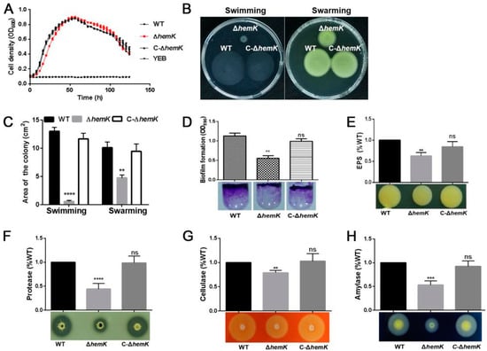 The growth characteristics of those three strains, grown in liquid yeast extract broth (YEB) medium, were first tested with the Bioscreen C automated microbiology growth curve analysis system. The growth curve of ΔhemK did not show obvious differences compared with that of wild-type and C-∆hemK (Figure 1A). Rich medium YEB was selected for subsequent bacterial phenotyping test.