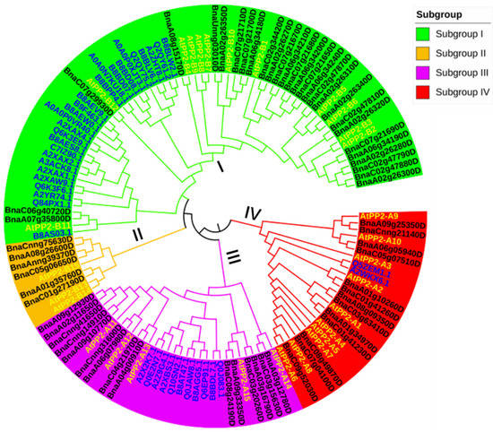 The phylogenetic analysis of PP2 proteins in A. thaliana, O. sativa and B. napus. All PP2 proteins were clustered into four subfamilies (I–IV) with differently colored branches (I, green; II, orange; III, purple; IV, red). The gene IDs for B. napus are black, the gene IDs for A. thaliana are bright yellow and those for O. sativa are blue.