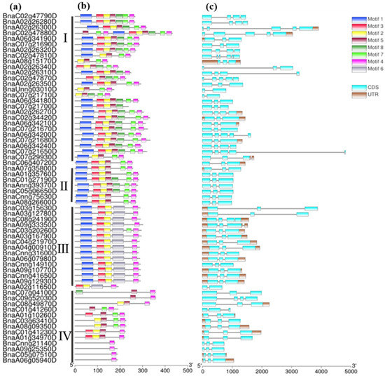 The gene structures and conserved motifs analysis of BnPP2 genes: (a) gene ID; (b) conserved motif distribution in BnPP2 proteins. Numbers 1–8 are displayed in differently colored boxes. Motif 1 is the F-box domain and motifs 2–7 are part of the PP2 domain, located at 16–44 aa,1–15 aa, 126–146 aa, 45–64 aa, 56–78 aa and 98–116 aa, respectively. Motif 3 and motif 2 are labeled as motif A, motif 4 is motif D, motif 7 is motif C and motifs 5 and 6 is motif B. Table S7 contains more detailed information. (c) The gene structures of BnPP2 genes. The dark brown boxes represent untranslated transcript regions (UTRs) and the blue boxes represent coding sequences (CDSs).
