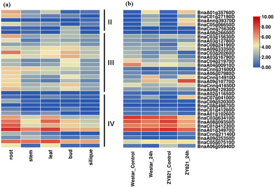 The expression patterns of the BnPP2 genes in clusters II–IV: (a) the expression heatmap of BnPP2 genes in various tissues from the root, stem, leaf, bud and silique; (b) the expression heatmap of BnPP2 genes in Westar and ZY821 cultivars at 0 and 24 h after S. sclerotiorum inoculation. The expression data were processed with the log2 normalization of fragments per kilobase million (FPKM).