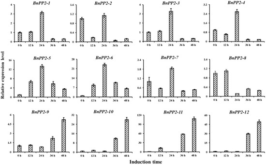 Furthermore, we selected 12 candidate BnPP2 genes, including 8 genes (BnaC03g63410D, BnaA01g34970D, BnaA08g09350D, BnaC01g41230D, BnaC04g21970D, BnaA04g00910D, BnaA03g16790D and BnaA06g05940D, named BnPP2-1 to BnPP2-8) that displayed decreased expression and 4 genes (BnaA09g10770D, BnaC07g04100D, BnaA01g35760D and BnaC05g06650D, named BnPP2-9 to BnPP2-12) that presented increased expression after fungi induction, to conduct experimental validation by quantitative real-time PCR (qRT-PCR). We collected leaves after inoculation with S. sclerotiorum to explore the dynamic gene expression changes at four time points (12 h, 24 h, 36 h and 48 h). The results showed that the expression levels of four genes, BnPP2-9 to BnPP2-12, were upregulated at all of the time points after S. sclerotiorum inoculation, which was consistent with the transcriptome data (Figure 4). However, the expression changes of the other candidate genes were complex. After inoculation, the expression of BnPP2-1 to BnPP2-7 first increased and reached a peak at 24 hpi, then decreased at 36 and 48 hpi, while BnPP2-8 reached its highest expression level at 12 hpi, then remarkably decreased at 24 hpi (Figure 4). These results indicated that the regulation of BnPP2-1 to BnPP2-8 for SD resistance was complicated. Therefore, a further sophisticated study is needed in this area.
