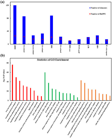 (a) The hormone-related and stress-related cis-acting regulatory elements in the promoters of the BnPP2 genes in clusters II–IV. The bar graph indicates the total number of each cis-acting element found in the BnPP2 promoters (royal blue box), as well as the number of BnPP2 promoters that included a specific cis-regulatory element (red circle). (b) The gene ontology enrichment analysis of proteins that interacted with BnPP2 proteins. Table S4 contains more detailed information.