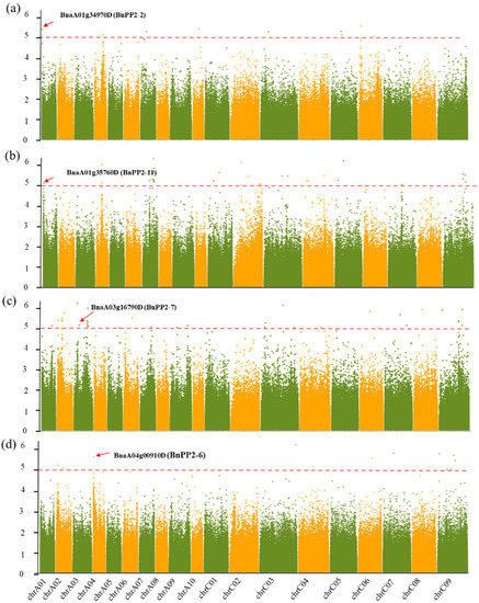 The genome-wide association analysis (GWAS) for SD resistance in a B. napus population comprising 324 accessions and Manhattan plots of SD resistance from association analyses: (a) Manhattan plots of the disease after 48–24 h; (b) Manhattan plots of the disease after 36–24 h; (c) Manhattan plots of the disease after 48 h; (d) Manhattan plots of the disease after 24 h. The red dashed line shows the GWAS threshold (1/SNP number).