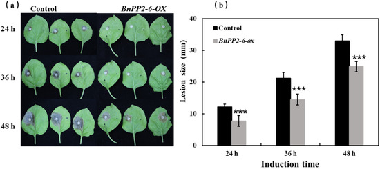 The functional validation of BnPP2-6 for SD resistance using transient expression in tobacco: (a) the disease lesion sizes on leaves at 24, 36 and 48 h post inoculation with S. sclerotiorum, transiently injected through agrobacterium containing BnPP2-6-ox recombinant vectors and empty vectors (negative control) into tobacco leaves; (b) the disease lesion sizes were analyzed statistically by comparing the overexpressed BnPP2-6 to the control. The data represent the means ± 2 SDs from three independent experiments, each containing 20 leaves. Significant differences in lesion sizes between BnPP2-6- Ox and the control are indicated (Student’s t-test) as follows: *** p < 0.001.