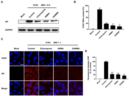 Figure 2. Inhibitory effect of ABMA and DABMA on H1N1 protein synthesis and RNA replication in cell cultures. MDCK cells were pretreated with ABMA or DABMA at 15 μM for 5 h and infected with A/NY/61/LV16A (H1N1, MOI = 0.5) for 1 h at 37 °C. Compounds were maintained until the end of the assay. Chloroquine (15 μM) was used as a positive control. (A) Nucleoprotein (NP) was detected by Western blotting using an anti-H1N1 NP antibody and an anti-GAPDH antibody was used as a loading control. (B) Relative viral RNA contents were measured by qRT-PCR using glyceraldehyde-3-phosphate dehydrogenase (GAPDH; Proteintech, 60004-1-Ig, Wuhan, China) as an internal control. (C) A549 cells were pretreated with ABMA, DABMA, or chloroquine at 15 µM for 5 h. At 16 h post infection with H1N1 (MOI = 1), cells were fixed in 4% paraformaldehyde and incubated with the primary antibody (anti-H1N1 NP, 1:100) overnight at 4 °C and incubated with the Cy5-conjugated goat anti-mouse (red) secondary antibody for 1 h at room temperature. The nuclei were stained with 4′,6-diamidino-2-phenylindole (DAPI; blue). Scale bar: 20 µm. (D) Quantitative measurements of fluorescence intensity of NP were evaluated using the Image J software (Version 1.4, National Institutes of Health, Bethesda, MD, USA). Data represent mean ± SEM (n = 3). Statistical significance was determined with one way ANOVA. Significance: *** p < 0.001 compared with virus control.
