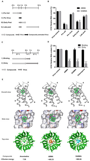 Figure 3. Inhibitory effects of ABMA and DABMA on H1N1 life cycle and M2 channel molecular docking studies. (A) ABMA or DABMA treatment of MDCK cells at 15 µM and A/NY/61/LV16A (H1N1, MOI = 1) infection schemes in the time of addition assay. (B) Viral RNA was extracted from the cells at 12 hpi and quantified by qRT-PCR. (C) ABMA or DABMA treatment of MDCK cells at 15 µM and H1N1 (MOI = 1) infection schemes in the binding and entry assays. (D) Viral RNA was extracted from the cell cultures and quantified by qRT-PCR. Data represent mean ± SEM (n = 3). The experiments were repeated twice independently. Statistical significance was determined with one way ANOVA. Significance: ** p < 0.01, *** p < 0.001 as compared to the virus control group. (E) Docking models of compounds in the M2 ion channel of IAV. Docking was performed using the crystal structure of the M2-amantadine complex with the PDB 6BKK access number. The −CDocker energies were calculated using Discovery Studio (Accelrys, San Diego, CA, USA). The top panel and bottom panel show the overall and top-view structures of the docking complexes, respectively. The middle panel shows the binding pocket from the side-view, in surface render mode without polypeptide chains B and C of M2. The major clashes of the side chains of the M2 polypeptide chains A and D are labeled by the amino acid residue types and their close inter-molecular distance with the compounds.