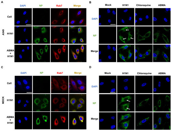 Figure 4. ABMA leads to an accumulation of H1N1 virions in late endosomes. (A) A549 cells or (C) MDCK cells were pretreated with ABMA (15 µM) for 5 h and infected with A/NY/61/LV16A (H1N1, MOI = 1). At 3 hpi, cells were fixed in 4% paraformaldehyde and incubated with the primary antibodies (mouse monoclonal anti-H1N1-NP, rabbit polyclonal anti-Rab7) overnight at 4 °C and incubated with the FITC-conjugated goat anti-mouse (green) and Cy5-conjugated goat anti-rabbit (red) secondary antibodies for 1 h at room temperature. (B) A549 cells or (D) MDCK cells were pretreated with ABMA (15 µM) or chloroquine (15 µM) for 5 h and infected with A/NY/61/LV16A (H1N1, MOI = 1). At 8 hpi, cells were fixed in 4% paraformaldehyde and incubated with the primary antibodies (mouse monoclonal anti-H1N1-NP) overnight at 4 °C and incubated with FITC-conjugated goat anti-mouse (green) secondary antibodies for 1 h at room temperature. The nuclei were stained with DAPI (blue). White arrows: NP in the nucleus. Scale bar: 20 µm.