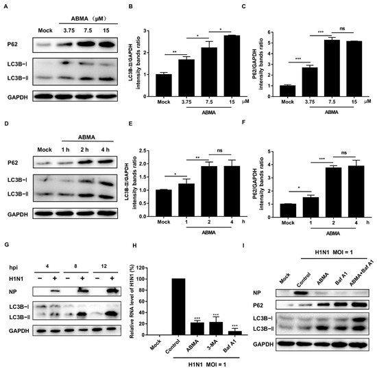 Figure 5. Inhibitory effects of ABMA on the autophagic flux and subsequent impacts on H1N1 infection. (AC) A549 cells treated with different concentrations of ABMA were harvested after 12 h of treatment and the autophagy markers LC3B-II and p62 were analyzed using Western blotting. (DF) A549 cells treated with 15 µM ABMA were harvested at different time points and the autophagy markers LC3B-II and p62 were analyzed using Western blotting. The band intensities were quantified using Image J software. (G) A549 cells were mock infected or infected with A/NY/61/LV16A (H1N1, MOI = 1) at different time points and the autophagy markers were analyzed using Western blotting. (H) A549 cells treated with 15 µM ABMA, 5 µM 3-MA, or 100 nM Baf A1 for 5 h were then mock infected or infected with the H1N1 virus (MOI = 1). Total RNA was extracted at 8 hpi, and the mRNA levels of the NP segment were quantified by qRT-PCR. Data represent mean ± SEM (n = 3). The experiments were repeated twice independently. Statistical significance was determined with a one way ANOVA. Significance: * p < 0.05, ** p < 0.01, *** p < 0.001, ns represents no significant difference. (I) A549 cells treated with 15 µM ABMA, 100 nM Baf A1, or 15 µM ABMA + 100 nM Baf A1 for 5 h were mock infected or infected with the H1N1 virus (MOI = 1). Cell lysates were harvested at 8 hpi and the autophagy markers were analyzed using Western blotting.