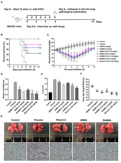 Figure 6. Evaluation of the therapeutic efficacy of ABMA and DABMA in H1N1 inoculated mice. (A) BALB/c mice were mock-infected or infected with H1N1 (1 × 109 EID50/50 µL) and were injected intraperitoneally with the different compounds once a day for six consecutive days. Survival rate (B) and body weight (C) of the mice (n = 9) were recorded daily for 14 days. Three additional mice in each group were sacrificed at 6 dpi for lung viral load (D), lung index (E), lung virus titer (F) determination, and lung morphological and H&E staining histopathological examinations (G). Data represent mean ± SEM. The experiments were repeated twice independently. Statistical significance was determined with one way ANOVA. Significance: * p < 0.05, ** p < 0.01, *** p < 0.001 compared with the placebo group in (B,DF). Significance: * p < 0.05, ** p < 0.01 for ABMA + H1N1 (5 mg/kg) or DABMA + H1N1 (5 mg/kg) compared with the placebo group in (C). Scale bar: 100 µm. Black arrows indicate inflammatory cell infiltration.