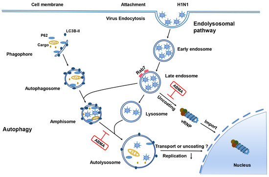 During viral infection, the virus–host autophagy interaction plays a critical role in the host response to the infection and the viral pathogenicity. Autophagy inhibits pathogenic infection by wrapping viruses in the autophagosome. However, much evidence indicates that virus-induced autophagy plays an important role in the viral life cycle and pathogenicity. The membranes of autophagy compartments can serve as a platform for viral genome replication and transport, such as Coxsackievirus B3, Human cytomegalovirus (HCMV), and Varicella-Zoster virus (VZV) [21,36,37]. We, thus, further investigated whether ABMA inhibits influenza infection by affecting autophagy. Western blot results showed that ABMA blocked the autophagy flux and caused autophagosome accumulation. The synthesis and replication of H1N1 were inhibited when autophagy was downregulated by the inhibitors (Figure 5). This suggests that the trafficking of influenza virus particles was delayed together with the autophagic vesicles and/or that the uncoating stage of the virus in these acidic vesicles was altered (Figure 7).