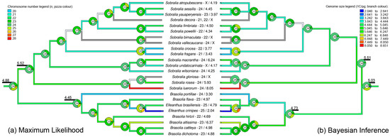 Maximum likelihood (a) and Bayesian Inference (b) pruned phylogenies showing the ancestral reconstruction of base chromosome number on nodes and genome size (1C-value) on branches. The ancestral genome size is indicated on the node for Brasolia, Sobralia, and the ancestral of both genera. The colour legend for the base chromosome number is on the right, and for genome size, on the left.