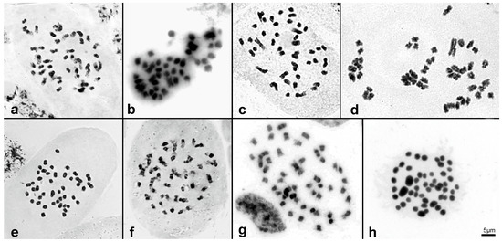 - Fukui, K.; Nakayama, S. Plant Chromosomes: Laboratory Methods; Fukui, K., Nakayama, S., Eds.; CRC Press: Boca Raton, FL, USA, 1996; pp. 1–288. [Google Scholar]