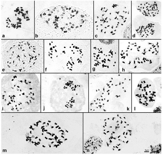 Chromosome complement of Sobralia species. (a) S. bimaculata (2n = 44), (b) S. decora (2n = 42), (c) S. decora (2n = 44), (d) S. fimbriata (2n = 46), (e) S. macrantha (2n = 48), (f) S. powelli (2n = 44), (g) S. vallecaucana (2n = 48), (h) S. wilsoniana (2n = 48), (i) S. yauaperyensis (2n = 46), (j) S. crocea (2n = 44), (k) S. fragrans (2n = 42), (l) S. gloriosa (2n = 48), (m) S. luerorum (2n = 48), (n) S. rosea (2n = 48). Bar in h correspond to 5 µm.