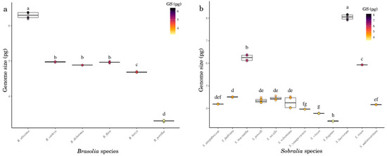 The genome size among Brasolia species ranged from 1C = 6.37 pg in B. altissima to 1C = 3.30 pg in B. portillae, representing a two-fold variation. According to 1C-value, Brasolia species could be organized into four groups (F = 3.719, p < 2 × 10−16; Figure 5a): the first represented by B. altissima with the largest genome size, the second group formed by B. cattleya-B. dichotoma-B. flava, the third composed by B. hirtzii, and the last group formed by B. portillae with the smallest genome size found in the genus (Figure 5a). The two Elleanthus species differ two-fold in their genome size, which enabled the identification of those two species based on the genome size (F = 5.622, p < 2 × 10−16; Table 1). Among the 12 Sobralia species, the estimated 1C-value presented a significant difference among species (F = 650, p < 2 × 10−16; Figure 5b), ranging from 1C = 3.43 pg in S. fragrans to 1C = 8.05 pg in S. luerorum (Table 1; Figure 5b). The three larger genome sizes were found in S. luerorum, S. macrantha, and S. rosea, while the two smaller ones were found in S. crocea and S. fragrans, while the remaining species formed a heterogeneous group without clear differentiation among species (Figure 5b).