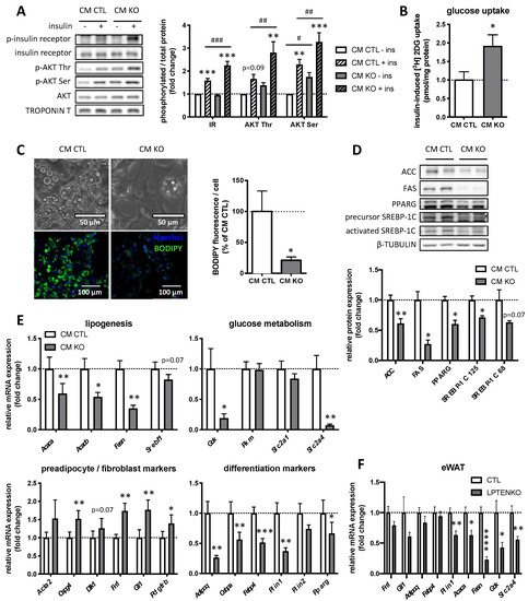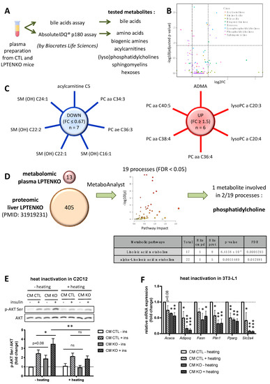 Metabolomic analyses of plasma from CTL and LPTENKO mice and thermosensitivity of CM. (A) Bile acids, amino acids, biogenic amines, acylcarnitines, lysophosphatidylcholines, phosphatidylcholines, sphingomyelins and hexoses were measured in plasma from control (CTL) and LPTENKO mice (Biocrates Life Sciences assays, 4 samples per group). (B) Volcano plot representation of the detected metabolites. Dashed lines represent fold change at 0.67 and 1.5 and adjusted p-value at 0.15 (t-test). (C) Sun diagrams summarizing the down- and upregulated metabolites in the LPTENKO plasma (fold change KO/CTL ≤ 0.67 and ≥1.5; adjusted p-value < 0.15). (D) Scheme illustrating the integration analysis performed on 02 February 2022 between the 13 deregulated metabolites of plasma from CTL vs. LPTENKO and the 405 deregulated proteins of liver from CTL vs. LPTENKO mice [35], using MetaboAnalyst 4.0. 19 processes were significantly enriched (false discovery rate (FDR) < 0.05). The table reporting pathways in which metabolites are involved is issued from the main table shown in Table S2. (E) Representative Western blot analyses of phosphorylated AKT (serine) and AKT protein expression in differentiated C2C12 cells exposed to heat inactivated CM from CTL and LPTENKO isolated primary hepatocytes for 24 h and treated or not with insulin (10 nM, 10 min) and quantifications. Denaturation of proteins in the CM was achieved by heating at 90 °C for 30 min. Values are means ± SEM of 3 independent experiments. (F) Relative mRNA expression of lipogenic/differentiation markers by RT-qPCR in 3T3-L1 adipocytes exposed to heat inactivated CM from CTL and LPTENKO isolated primary hepatocytes. Ppia and Rps9 were used as reference genes to normalize the RT-qPCR analyses. Denaturation of proteins in the CM was achieved by heating at 90 °C for 30 min. Values are means ± SEM of 3 independent experiments. *: p ≤ 0.05, **: p ≤ 0.01, ***: p ≤ 0.001 (one- and two-way ANOVA for (E,F), respectively).