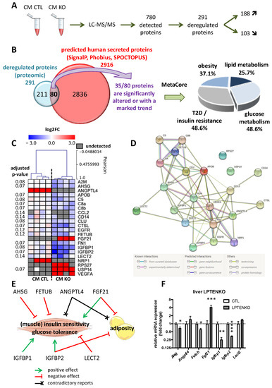 To uncover secreted hepatocytes-specific protein factors potentially triggering insulin hypersensitivity in muscles and decreased adiposity, CMs of MPH isolated from either CTL or LPTENKO mice were submitted to liquid chromatography and mass spectrometry (LC-MS/MS) analyses. Over the 780 identified proteins, 291 were deregulated (DEGs) in the CM of MPH from LPTENKO mice as compared to CTL mice. Among these 291 secreted proteins, 188 were upregulated (fold change CTL/KO ≤ 0.25) and 103 downregulated (fold change CTL/KO ≥ 1.33) in the CM of MPH from LPTENKO mice (Figure 3A and Table S3). To narrow down the number of candidates of potential interest identified by our proteomic analysis, we then focused on well-established secreted proteins based on the presence of a signal peptide for secretion. Among the DEGs, only 80 proteins possess a signal peptide for secretion based on cross-referring with a list of predicted human secreted proteins established from three different prediction algorithms (SignalP 4.0, Phobius and SPOCTOPUS) and only 35 of the 80 DEGs were significantly deregulated based on an adjusted p-value < 0.15 (Figure 3B and Table S4). MetaCore analyses of these 35 DEGs candidates indicated that 48.6% of them were associated with IR/T2D, 48.6% with the glucose metabolism, 37.1% with obesity and 25.7% with the lipid metabolism (Figure 3B). We thus further restricted our analyses to the 20 candidates involved in these processes with the addition of two other relevant factors, LECT2 and FETUB, which we identified in our proteomic analysis but, unexpectedly, were not identified by the MetaCore program, despite previous reports highlighthing their role in metabolic diseases [13,14,36,37] (Figure 3C). All of these 22 candidates (with the exception of CCL2, CTSL, RPS27 and USP14) are detected in human serum and are produced and secreted mostly, otherwise exclusively, by hepatocytes (Table S5). An analysis of these 22 proteins with STRING database indicates that they constitute a network via protein–protein interactions and/or co-expressions patterns indicating a functional link in metabolic disorders (Figure 3D). Among these 22 candidates, the deregulation of seven hepatokines, i.e., AHSG (fetuin-A), ANGPTL4, FETUB (fetuin-B), FGF21, IGFBP1, IGFBP2 and LECT2, was further considered since, based on their role described in the literature and correlation of their expression with muscle insulin sensitivity, glucose tolerance and adiposity, they were potential candidate secreted factors associated with the metabolic phenotype of LPTENKO mice (Figure 3E and Table S6). Of note, among these seven hepatokines, the FGF21 protein expression was detected only in CM of MPH from LPTENKO mice, whereas the ANGPTL4 protein was present only in CM of MPH from CTL mice. The remaining five hepatokines (AHSG, FETUB, IGFBP1, IGFBP2 and LECT2) were all decreased at the protein level in the CM of MPH from LPTENKO mice as compared to CTL (Figure 3C). Importantly, an mRNA analyses of these seven hepatokines in the liver of 4-month old LPTENKO mice correlated with the protein levels quantitated by our proteomic analysis, except for Angptl4 and Lect2, indicating that the expression of AHSG, FETUB, FGF21, IGFBP1 and IGFBP2 was deregulated at the transcriptional level by PTEN deficiency in hepatocytes, whereas post-transcriptional mechanisms were likely involved in the deregulation of ANGPTL4 and LECT2 (Figure 3F). To exclude the idea that these alterations were due to adaptive and/or developmental compensatory mechanisms potentially occurring in the constitutive liver-specific PTEN knockout mice (LPTENKO mice), the deregulated mRNA expression of these seven hepatokines was further confirmed in a model of tamoxifen-inducible PTEN knockout specifically in hepatocytes (LIPTENKO) that we previously generated [38] at 5 months of age following the induction of the knockout at 2 months of age (Figure S2G). Of note, three months after tamoxifen-induced PTEN silencing, LIPTENKO mice faithfully recapitulate the phenotype of LPTENKO mice with a constitutive deletion of PTEN in hepatocytes. These mice indeed display hepatomegaly, an improved glucose tolerance with a decrease glucose hepatic output in response to insulin, hepatic steatosis and a decreased adiposity (Figure S2A–F).