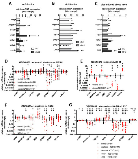 mRNA expression of hepatokines in the liver of mouse models and human with obesity, IR, NAFLD/NASH or type 2 diabetes. Relative mRNA expression of hepatokines by RT-qPCR in the liver of ob/ob mice (A), db/db mice (B) and mice fed for 18 weeks with a HFD (C). Ppia was used as reference gene to normalize the RT-qPCR analyses. Values are means ± SEM of 5–8 mice per group. (D–G) Hepatokines mRNA expression in the liver of several cohorts of obese, type 2 diabetes (T2D) and/or NAFLD/NASH patients obtained from public Gene Expression Omnibus (GEO) datasets. See Table S8 for details. *: p ≤ 0.05, **: p ≤ 0.01, ***: p ≤ 0.001, ****: p ≤ 0.0001 (t-test).