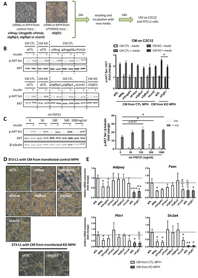 First, 5 h after plating, mouse primary hepatocytes (MPH) were washed twice with PBS and cultured for 24 h in deprivation medium. The conditioned media (CM) were then collected and filtered through 0.22 µM filters before use on differentiated C2C12 cells for 24 h or for the differentiation of 3T3-L1 cells for 8 days. Alternatively, 5 h after seeding, a part of MPH was transiently transfected with specific siRNA (20 nM) for 24 h using Viromer® Blue following the manufacturer’s instructions. They were then washed twice with PBS and cultured for another 24 h in a deprivation medium in order to prepare the conditioned media. In a conditioned media fraction, the denaturation of secreted proteins was achieved by heating at 90 °C for 30 min followed by immediate storage on ice.