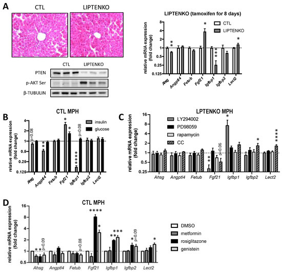 Regulation of hepatokines expression in hepatic tissues and isolated mouse primary hepatocytes. (A) Representative liver histology (H&E staining), representative Western blot analyses of PTEN and AKT phosphorylation (serine) and relative mRNA expression of hepatokines by RT-qPCR in the liver of liver-inducible PTENKO mice treated with tamoxifen for 8 days. β-TUBULIN was used as a gel loading marker and Ppia was used as reference gene to normalize the RT-qPCR analyses. Values are means ± SEM of 6 mice per group. (B) Relative mRNA expression of hepatokines by RT-qPCR in control mouse primary hepatocytes (MPH) treated with insulin (10 nM) or glucose (4.5 g/L) for 6 h. For each gene, the mean of respective control group is normalized to 1. Ppia was used as reference gene to normalize the RT-qPCR analyses. Values are means ± SEM of 4 independent experiments. (C) Relative mRNA expression of hepatokines by RT-qPCR in LPTENKO mouse primary hepatocytes treated with dimethylsulfoxide (DMSO, control), 20 μM LY294002 (PI3K inhibitors), 25 μM PD98059 (MEK inhibitor), 250 nM rapamycin (mTOR inhibitor) or 25 μM compound C (AMPK inhibitor) for 24 h. For each gene, the mean of control group (primary hepatocytes from LPTENKO mice treated with DMSO) is normalized to 1. Ppia and Rps9 were used as reference genes to normalize the RT-qPCR analyses. Values are means ± SEM of 3–4 independent experiments. (D) Relative mRNA expression of hepatokines by RT-qPCR in control mouse primary hepatocytes (MPH) treated with dimethylsulfoxide (DMSO, control), 100 μM metformin, 20 μM rosiglitazone or 20 μM genistein for 24 h. Ppia and Rn18s were used as reference genes to normalize the RT-qPCR analyses. Values are means ± SEM of 4 independent experiments. *: p ≤ 0.05, **: p ≤ 0.01, ***: p ≤ 0.001, ****: p ≤ 0.0001 (t-test for (A,B), one-way ANOVA for the others).