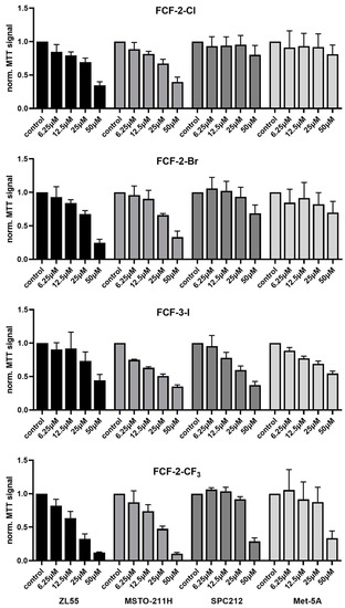 At first sight, it is noticeable that the profiles (normalized MTT signals obtained after 96 h of treatment) of all 11 tested substances (FCF and 10 analogs) were rather similar in the mostly epithelioid ZL55 and MSTO-211H cells (Figure 1). Globally, MSTO-211H cells showed a slightly higher sensitivity (lower MTT signals) towards the effects of the FCF analogs than the ZL55 cells. Compared to the untreated cells, the MTT signals were lower in ZL55 and MSTO-211 cells treated with FCF and its analogs, as confirmed by the ANOVA and post-hoc analyses (Supplementary Table S2). The decreases were significant with all compounds, with the exception of the FCF-2-OCH3 analog in both cell lines and additionally FCF-2-CH3 in ZL55 cells. With the selected concentration of 50 µM, significant decreases were obtained with all of the halogenated FCF analogs and the one containing a trifluoromethyl (CF3) group in the 2-position.