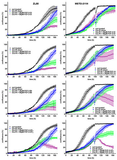 Real-time growth curves of human ZL55 and MSTO-211H cells exposed to cisplatin (Cis-Pt) alone for 96 h, followed by supplemental treatment with FCF-2-Cl, FCF-3-I, FCF-2-Br and FCF-2-CF3 for an additional 72 h at concentrations of 25 and 50 µM. The representative growth curves of non-treated MM cells are shown in black. A plateau at near 100% confluence is reached at ~100 h in MSTO-211H cells, and at >140 h in ZL55. Treatment with cisplatin (1.25 µM) strongly reduces MTT signals for the first ~60 h. From then on, an increasing number of cisplatin-resistant cells appear. At 96 h, FCF and its three analogs (FCF-3-I, FCF-2-Br and FCF-2-CF3) were added at 25 µM (green curves) and 50 µM (magenta curves), or they were left to grow in the presence of cisplatin only (blue curves). The latter cells reached near-100% confluence at 168 h, while the addition of FCF (and its analogs) decreased the confluence to various extents. The values in the curves represent the mean ± SD from three wells obtained within one experiment. The scattered values at 96 h are the results of the brief removal of the plates from the Incucyte system to add the FCF and its analogs.