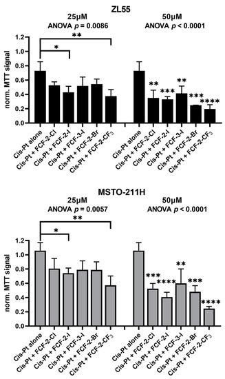 Quantitative analyses of MTT signals obtained at day 7 revealed similar proliferation/viability decreases in ZL55 and MSTO-211H cells (Figure 4). The significant additional effects exerted by the FCF analogs compared to cisplatin alone were more obvious at 50 µM than at 25 µM (the ANOVA and post-hoc analyses are shown in Figure 4). With a concentration of 25 µM, the effects of FCF-2-Cl, FCF-2-I, FCF-3-I and FCF-2-Br were nearly identical in both MM cell lines, i.e., an additional reduction of the MTT signals in the order of ≈20–30% in comparison to cisplatin alone. A slightly stronger (and significant) effect was observed with FCF-2-I and FCF-2-CF3. The impairment of proliferation/viability was further enhanced at 50 µM in both MM cell lines. Under these conditions, the FCF-3-I analog was slightly less potent than the 2-analogs (FCF-2-Cl, FCF-2-I and FCF-2-Br), in line with the findings that 3-analogs were generally less potent in epithelioid MM cells (Figure 1). Again, FCF-2-CF3 exerted the strongest effect, also at the higher concentration.