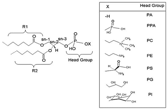 Via the de novo route, different GPs with diverse polar heads at sn-3 position of glycerol, such as phosphatidic acid (PA), phosphatidylcholine (PC), phosphatidylethanolamine (PE), phosphatidylserine (PS), phosphatidylglycerol (PG), and phosphatidylinositol (PI) are generated []. Figure 1 illustrates the structure of common GPs.