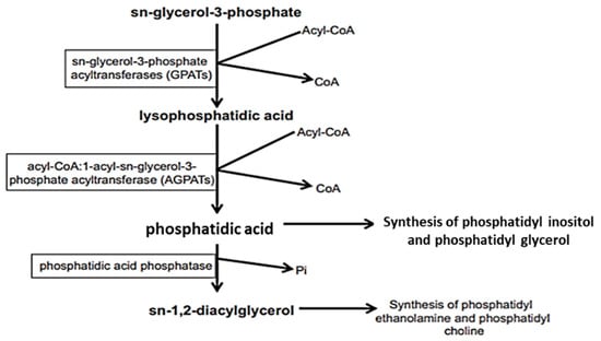 Phosphatidic acid (PA) is the common intermediate in all PLs’ synthesis. Lysophosphatidic acid is first formed from sn-glycerol-3-phosphate by acylation in the presence of sn-glycerol-3-phosphate acyltransferase (GPATs) and acyl-CoA. Following, a second acylation of lysophosphatidic acid in the presence of 1-acyl-sn-glycerol-3-phosphate acyltransferase (AGPATs) and acyl-CoA will lead to PA formation (Figure 2). PA is transformed into sn-1,2-diacylglycerol (DAG) by a phosphatidic acid phosphatase, releasing a phosphate group (Pi). DAG is the precursor of PCs and PEs.