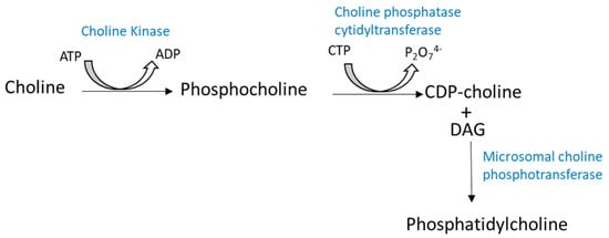 PC is one of the major PLs (35 to 50%) in cell membranes and is mainly synthesized in the Golgi apparatus and mitochondria []. PC is found in the outer layer of a cell’s membrane. The main pathway for PC synthesis is from choline via the Kennedy pathway or the cytidine diphosphate-choline (CDP−choline) pathway (Figure 3) []. There is another pathway for PC biosynthesis from PE following three successive methylations.