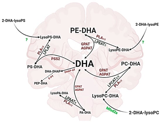 Figure 7 summarizes DHA’s de-acylation, re-acylation, and transacylation pathways in the brain. The cerebral DHA pool is maintained by the action of key enzymes, such as phospolipase A (PLA), lysophospholipid acyl transferase (LPLAT), glycerol-3-phosphate acyltransferase (GPAT), and 1-acylglycerol-3-phosphate-O-acyltransferase (AGPAT). These enzymes are involved in PL and LysoPL’s metabolism in the brain. In addition, the transfer of the esterified form of DHA from blood to the brain through the BBB keeps this pool constant. This transfer is facilitated by Mfsd2a receptor when DHA is esterified in LysoPC-DHA. However, the transfer of other LysoPL-DHA including LysoPE-DHA and LysoPS-DHA is still not clear.