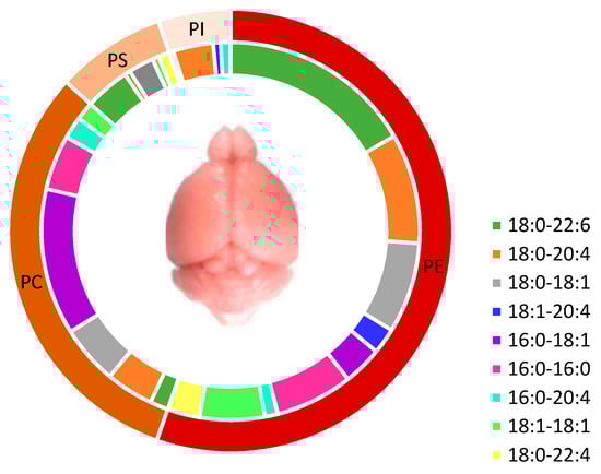 In the brain, PUFAs, mainly DHA and AA, are mostly found in PE species (including PEP) with PE 18:0-2:6 (11%) and PE 18:0-20:4 (8%). However, in PC, monounsaturated fatty acids (MUFA) and saturated fatty acids (SFA) are the major FAs with 54% compared to PUFAs (15%). PS contains more DHA than PC (51%) (Figure 8). In PI, AA is the major PUFA compared to DHA and EPA [].