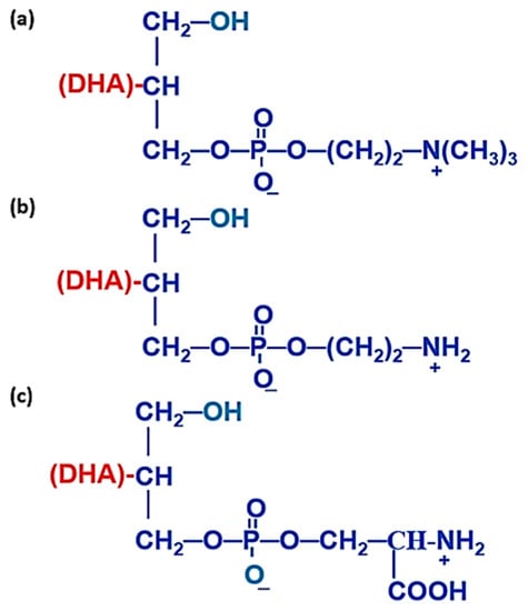 Chemical representation of some lysophospholipids with DHA moiety at sn-2 position. (a) 1-lyso,2-docosahexaenoyl, glycerophosphocholine (Lyso-PC-DHA), (b) 1-lyso,2-docosahexaenoyl,glycerophosphatidylethanolamine (Lyso-PE-DHA), (c) 1-lyso,2-docosahexaenoyl, glycerophosphatidylserine (Lyso-PS-DHA).