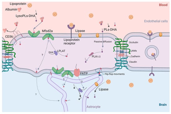 - Nguyen, L.N.; Ma, D.; Shui, G.; Wong, P.; Cazenave-Gassiot, A.; Zhang, X.; Wenk, M.R.; Goh, E.L.K.; Silver, D.L. Mfsd2a is a transporter for the essential omega-3 fatty acid docosahexaenoic acid. Nature 2014, 509, 503–506. [Google Scholar] [CrossRef] [PubMed]