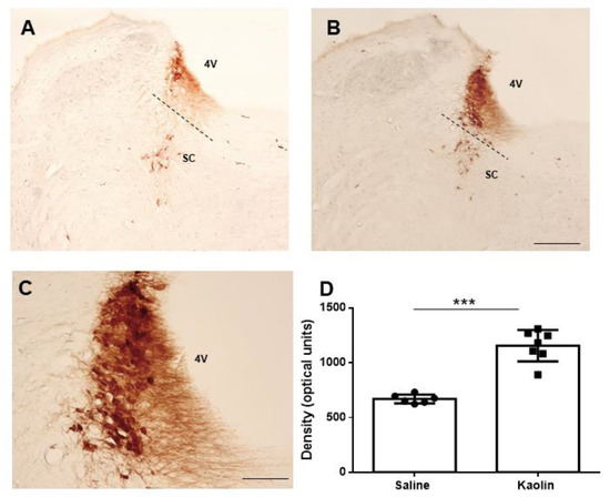 TH-immunoreaction at the LC was recognized by dense brown immunostaining (Figure 2A,B). The intense staining precluded the identification of neurons immunoreactive to TH (TH-IR) which was mostly due to the density of the neuropil, as described previously [33,34]. Kaolin-injected animals presented an increase in the density of TH-immunoreaction, including cell bodies and neuropil, in the LC in comparison with the control animals (p < 0.001). The images in Figure 2A,B depict approximately the same rostrocaudal level (around 0.8 mm caudal to the interaural line). To allow a better identification of the effects of kaolin injection in the LC, representative sections taken from three rostrocaudal levels of 6 distinct animals were included in Figure A1.