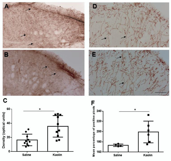 Immunohistochemical analysis of TH (A–C) and DBH (D–F) expression at the spinal dorsal horn in animals injected with saline (A,D) or kaolin (B,E). Representative photomicrographs of TH- and DBH-immunolabelling at the spinal dorsal horn are shown and the details of the immunoreactivity are pointed by the arrows, namely fibers with some varicosities. Kaolin-injected animals presented increases in TH (C) and DBH (F) expression in the spinal dorsal horn. For TH: Saline n = 10; Kaolin n = 10. For DBH: Saline: 4; Kaolin = 6. Scale bar in A: 100 µm; (A,B,D,E) are at the same magnification. Data in (C,F) are presented as means ± SEM. * p < 0.05.